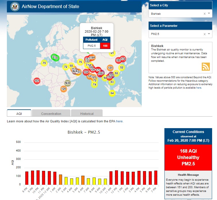 Посольство США в Кыргызстане также установило датчик. Он показывает индекс качества воздуха в режиме онлайн. Информация обновляется ежечасно.