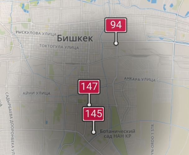 По нормам ВОЗ среднегодовой уровень РМ2.5 должен составлять не больше 10 мкг/м³, а среднесуточный — не больше 25 мкг/м³. В национальном законодательстве КР — 35 мкг/м³. Именно он взят для расчетов. Разовая допустимая концентрация, по данным «МувГрин», установленная в национальном законодательстве, — 160 мкг/м³.