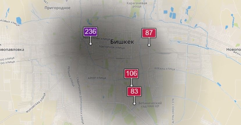 - в районе улиц Бейшеналиевой/Токтогула. Уровень загрязнения превышен в 4,28 раза: PM2.5 среднесуточный — 150 мкг/м³, на момент измерения — 236 мкг/м³;