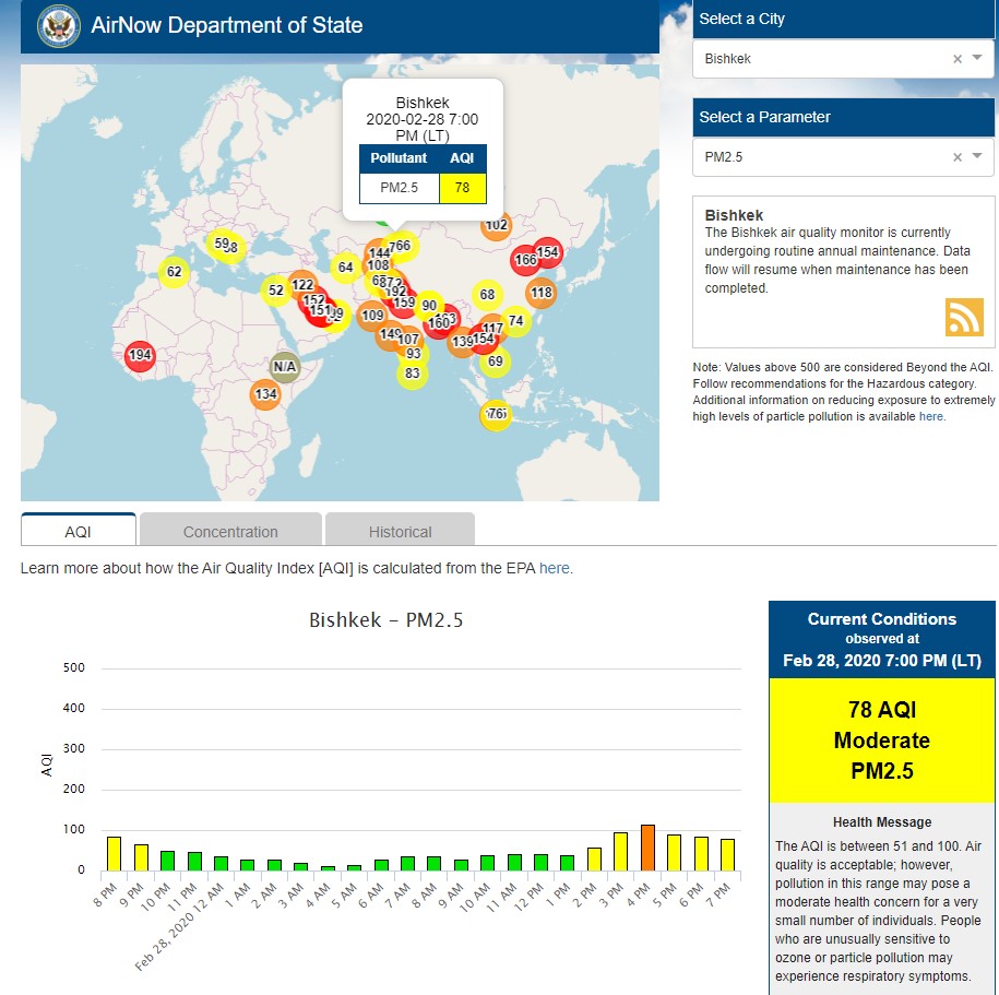 Посольство США в Кыргызстане также установило датчик. Он показывает индекс качества воздуха в режиме онлайн. Информация обновляется ежечасно.