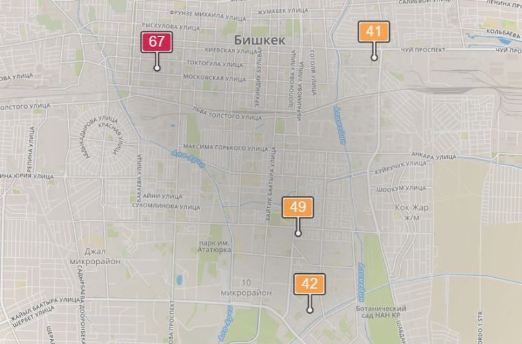 По нормам ВОЗ среднегодовой уровень РМ2.5 должен составлять не больше 10 мкг/м³, а среднесуточный — не больше 25 мкг/м³. В национальном законодательстве КР — 35 мкг/м³. Именно он взят для расчетов. Разовая допустимая концентрация, по данным «МувГрин», установленная в национальном законодательстве, — 160 мкг/м³.