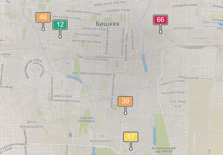 - в районе улиц Бейшеналиевой/Токтогула. Уровень загрязнения превышен в 1,2 раза: PM2.5 среднесуточный — 42 мкг/м³, на момент измерения — 46 мкг/м³;
