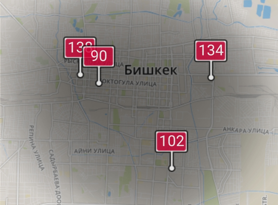 - в районе улиц Бейшеналиевой/Токтогула. Уровень загрязнения превышен в 2,91 раза: PM2.5 среднесуточный — 102 мкг/м³, на момент измерения — 138 мкг/м³;