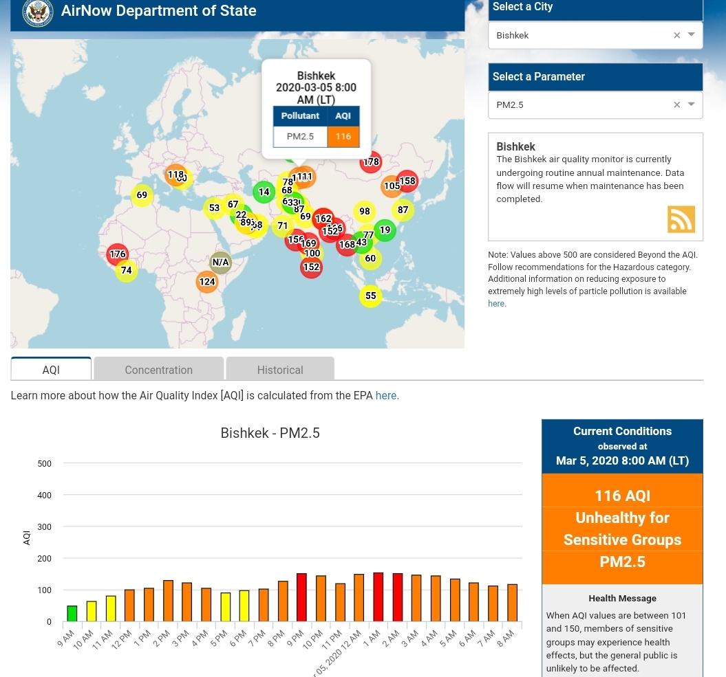 Посольство США в Кыргызстане также установило датчик. Он показывает индекс качества воздуха в режиме онлайн. Информация обновляется ежечасно.