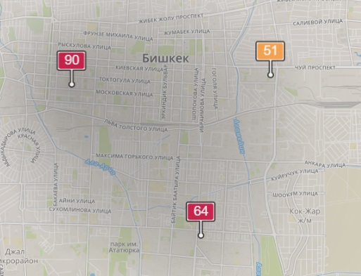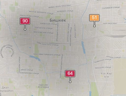 - в районе улиц Московской/Уметалиева. Уровень загрязнения превышен в 1,69 раза: PM2.5 среднесуточный — 59 мкг/м³, на момент измерения — 90 мкг/м³;