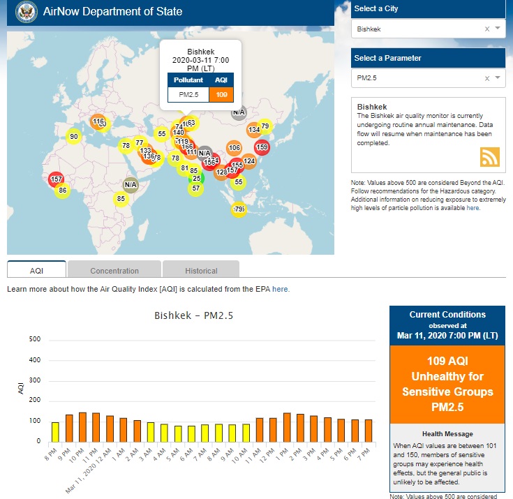 Посольство США в Кыргызстане также установило датчик. Он показывает индекс качества воздуха в режиме онлайн. Информация обновляется ежечасно.