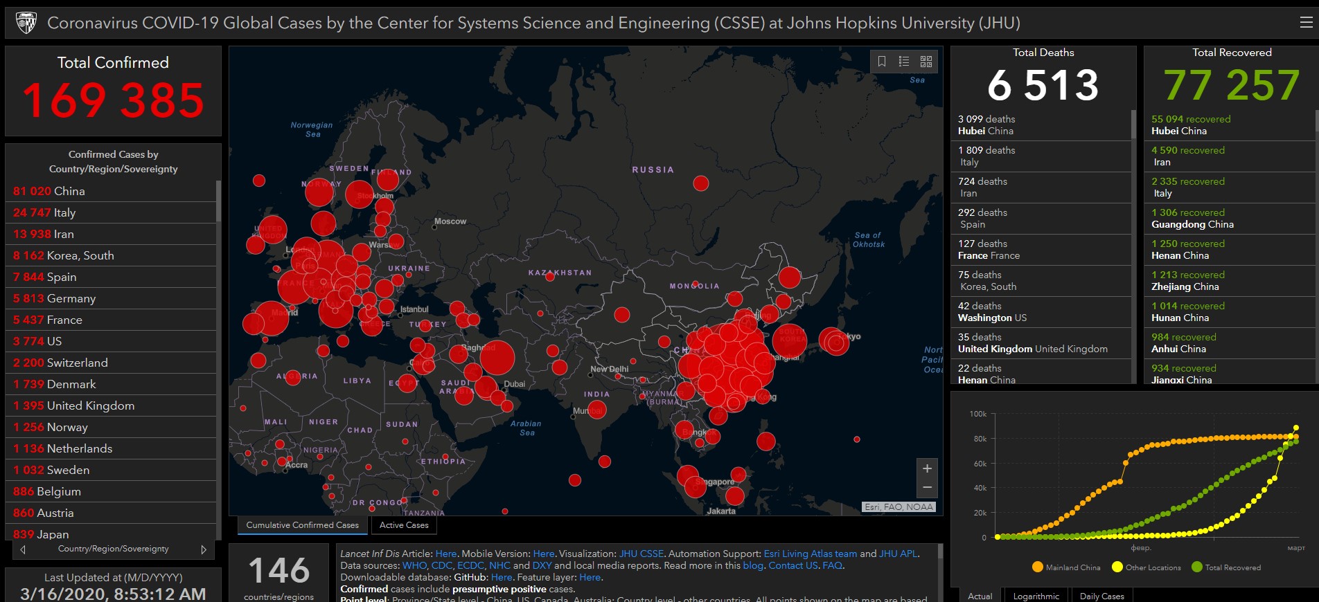 На сегодня коронавирус зафиксирован в 146 странах мира.