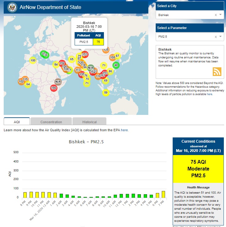 Посольство США в Кыргызстане также установило датчик. Он показывает индекс качества воздуха в режиме онлайн. Информация обновляется ежечасно.