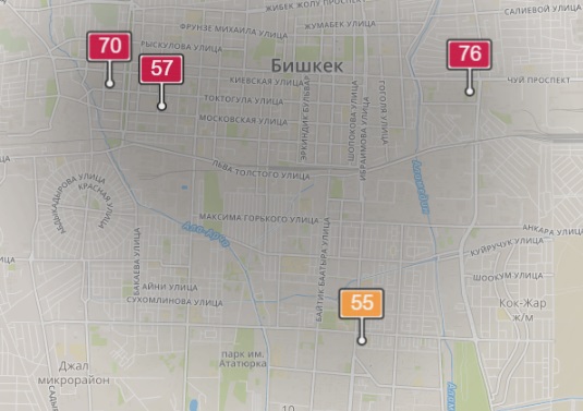 - в районе улиц Бейшеналиевой/Токтогула. Уровень загрязнения превышен в 1,09 раза: PM2.5 среднесуточный — 38 мкг/м³, на момент измерения — 70 мкг/м³;