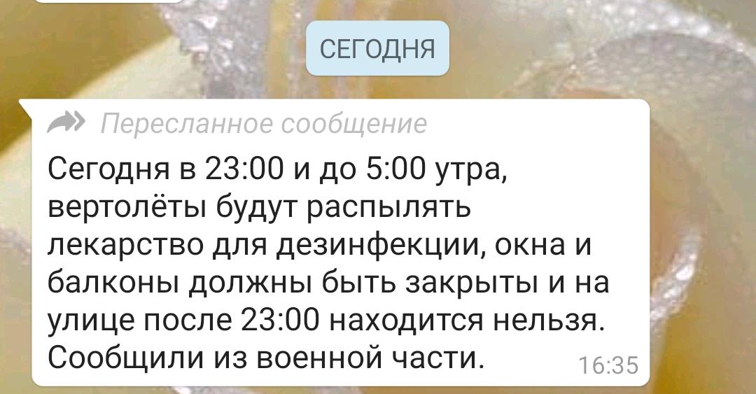 В мессенджере WhatsApp рассылается информация о том, что сегодня с 23.00 до 5.00 вертолеты будут распылять лекарства для дезинфекции.