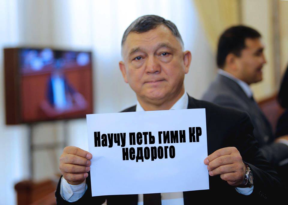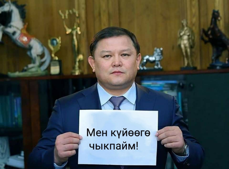 Однако пальма первенства досталась спикеру парламента Дастанбеку Джумабекову. Торага решил не отставать от своих коллег и поддержал акцию. Он сфотографировался не в зале заседания, а очевидно, в своем кабинете. Снимок быстро разлетелся по соцсетям, а креативные кыргызстанцы, применив фотошоп, заменили лозунг забавными шуточными надписями.