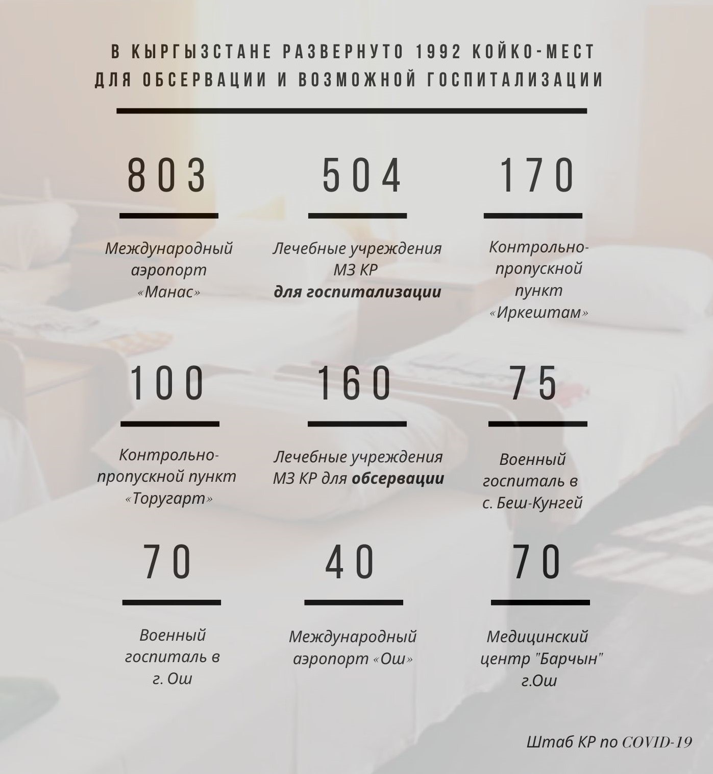 Пункты обсервации и госпитализации также расположены в лечебных учреждениях Минздрава, на контрольно-пропускных пунктах «Иркештам» и «Торугарт», в военных госпиталях в селе Беш-Кунгей близ Бишкека и в Оше, в медицинском центре «Барчын».
