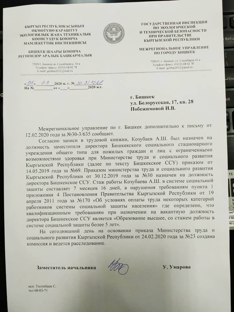 Это уже не первый скандал в данном соцучреждении. Экс-директор Эркингуль Абдылдаева судилась с Министерством социального развития и труда из-за незаконного увольнения. Она выиграла суд.