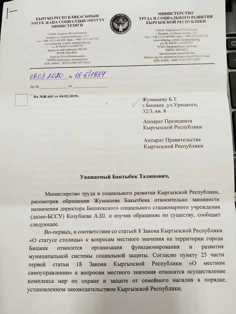 Он добавил: в министерстве назначение объяснили тем, что глава ведомства Улукбек Кочкоров подписал приказ о назначении, «учитывая пожелания получателей услуг БССУ».