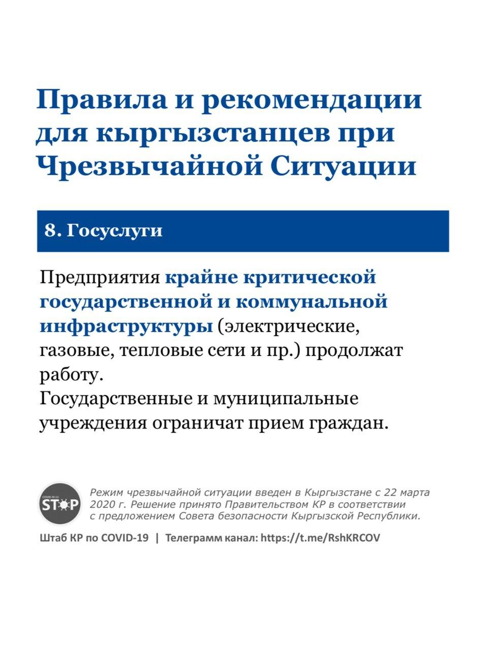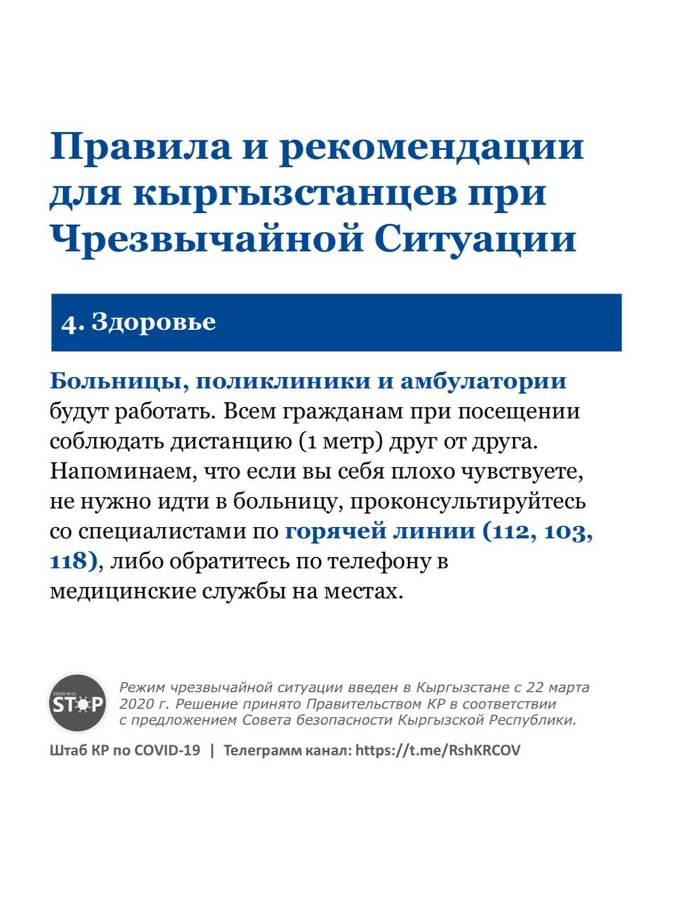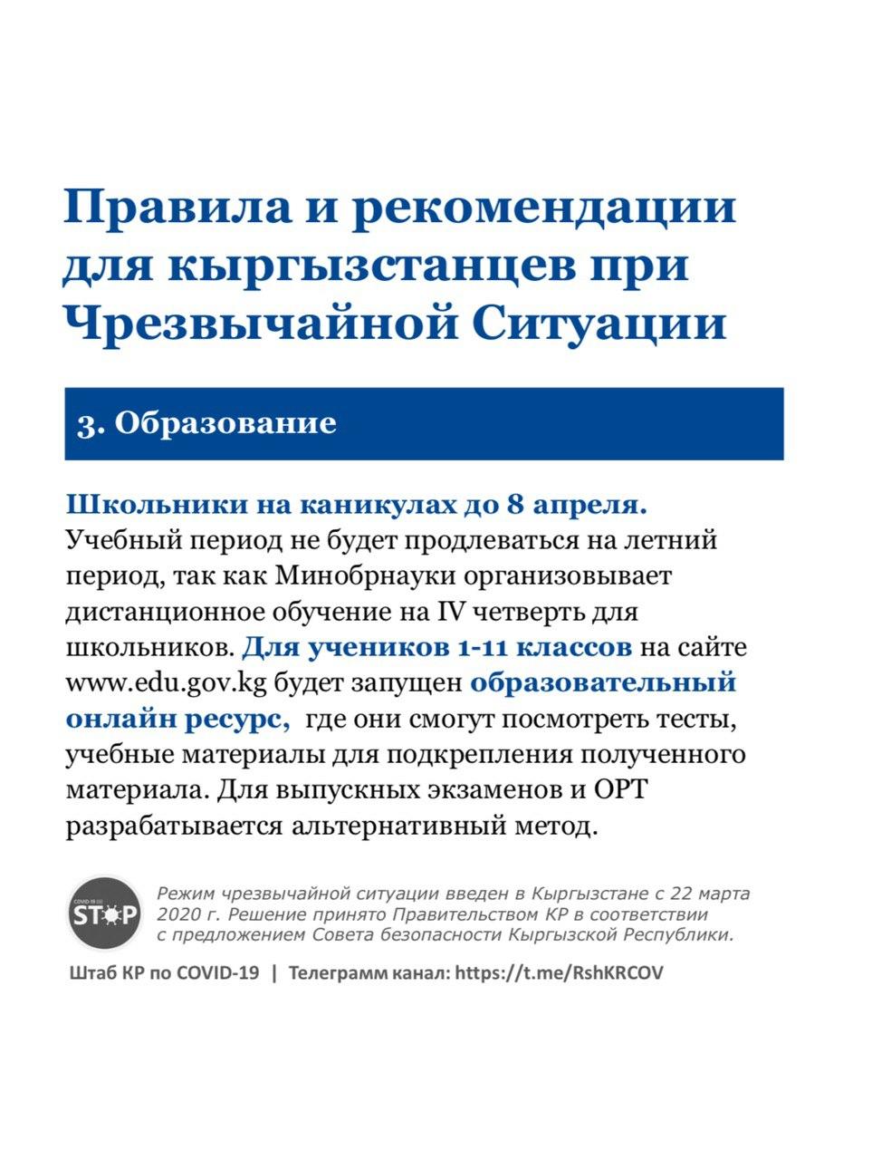 Для школьников предусмотрены дистанционные варианты обучения. По экзаменам и ОРТ разрабатывают альтернативные методы. Больницы, поликлиники и амбулатории работают в прежнем режиме.