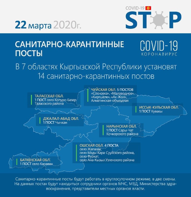 Санитарно-карантинные посты будут работать в круглосуточном режиме, в две смены.На сегодня в Кыргызстане зарегистрировали 14 случаев заражения коронавирусом. В республике ввели режим чрезвычайной ситуации.
