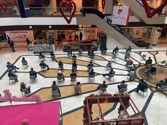 По словам автора фото, граждан, которые пришли в отделение банка, рассадили по всему периметру ТЦ в метре друг от друга.