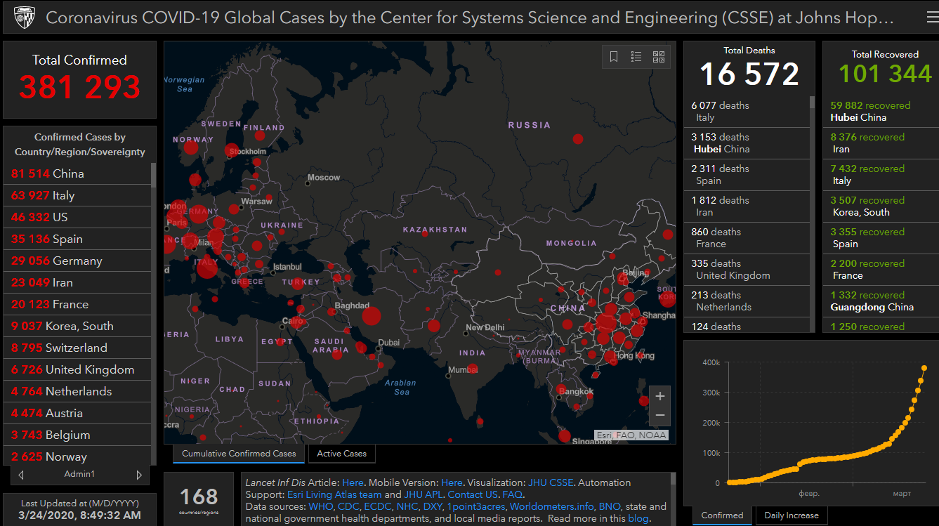 Вне Китая заразились 378,5 тысячи человек, а в самой республике — 81 тысяча 514. Больше всего зараженных в Италии (63 тысячи 927), США (46 тысяч 332), Испании (35 тысяч 136), Германии (29 тысяч 56), Иране (23 тысячи 49) и Франции (20 тысяч 123).