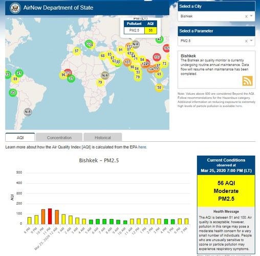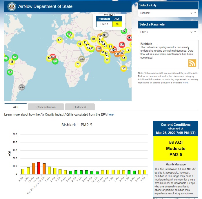 Посольство США в Кыргызстане также установило датчик. Он показывает индекс качества воздуха в режиме онлайн. Информация обновляется ежечасно.