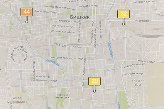 - в районе улиц Бейшеналиевой/Токтогула. Уровень загрязнения превышен в 1,29 раза: PM2.5 среднесуточный — 45 мкг/м³, на момент измерения — 44 мкг/м³;