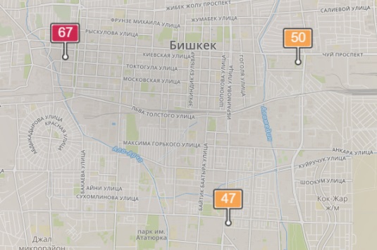 - в районе улиц Бейшеналиевой/Токтогула. Уровень загрязнения превышен в 1,5 раза: PM2.5 среднесуточный — 53 мкг/м³, на момент измерения — 67 мкг/м³;