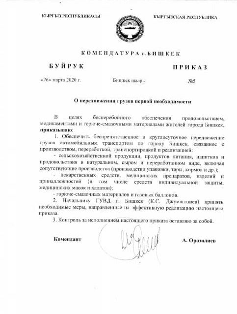 В целях облегчения передвижения грузов первой необходимости по Бишкеку в период чрезвычайного положения предоставляется копия приказа, подписанная заместителем министра внутренних дел – комендантом столицы Алмазом Орозалиевым. Об этом сообщил республиканский штаб.