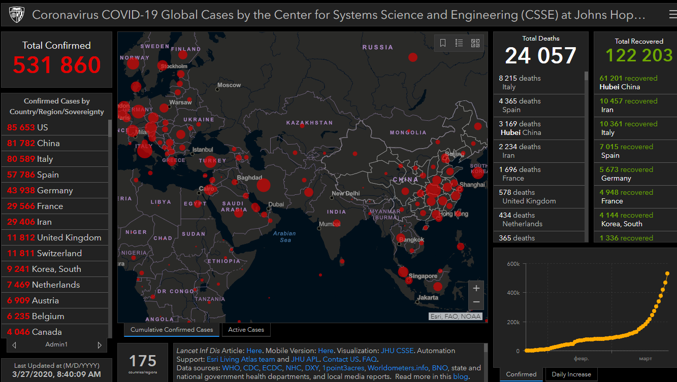 После заражения коронавирусом скончались 24 тысячи 57 человек (рост на 2 тысячи 781 за сутки). В том числе в Италии умерли 8 тысяч 215 человек, Испании — 4 тысячи 365 и Хубэе — 3 тысячи 169.В Кыргызстане зарегистрировали 44 случая заражения коронавирусом. В Казахстане — 113 случаев, Узбекистане — 75. Все эти государства закрыли границы, чтобы не допустить распространения вируса. Из стран Центральной Азии вируса пока нет только в Таджикистане и Туркменистане.