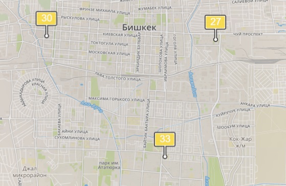 - в районе улиц Бейшеналиевой/Токтогула. Уровень загрязнения превышен в 1,46 раза: PM2.5 среднесуточный — 51 мкг/м³, на момент измерения — 30 мкг/м³;