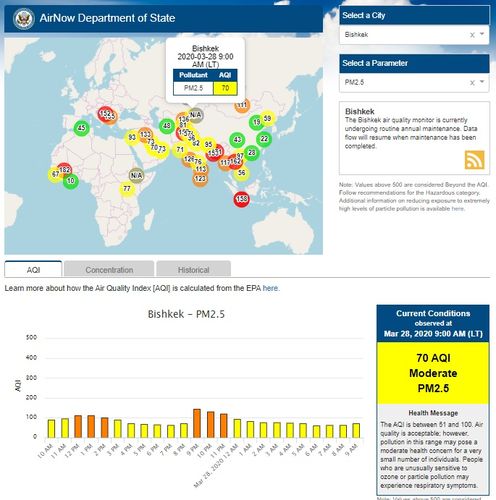 Посольство США в Кыргызстане также установило датчик. Он показывает индекс качества воздуха в режиме онлайн. Информация обновляется ежечасно.