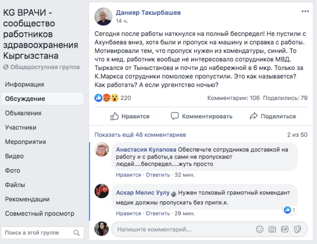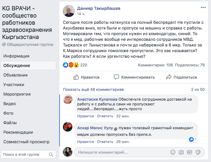 В соцсетях другие врачи также жалуются на несогласованность действий сотрудников МВД с комендатурой. Реаниматолог-анестезиолог Наццентра охраны материнства и детства Данияр Такырбашев также сообщил в соцсетях, что не мог проехать через блокпост, несмотря на наличие пропуска и справки с работы.