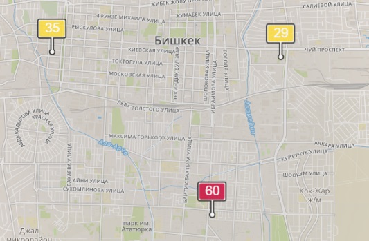 - в районе улиц Бейшеналиевой/Токтогула. Уровень загрязнения превышен в 1,06 раза: PM2.5 среднесуточный — 37 мкг/м³, на момент измерения — 35 мкг/м³;
