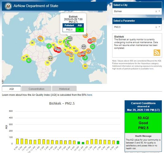 Посольство США в Кыргызстане также установило датчик. Он показывает индекс качества воздуха в режиме онлайн. Информация обновляется ежечасно.