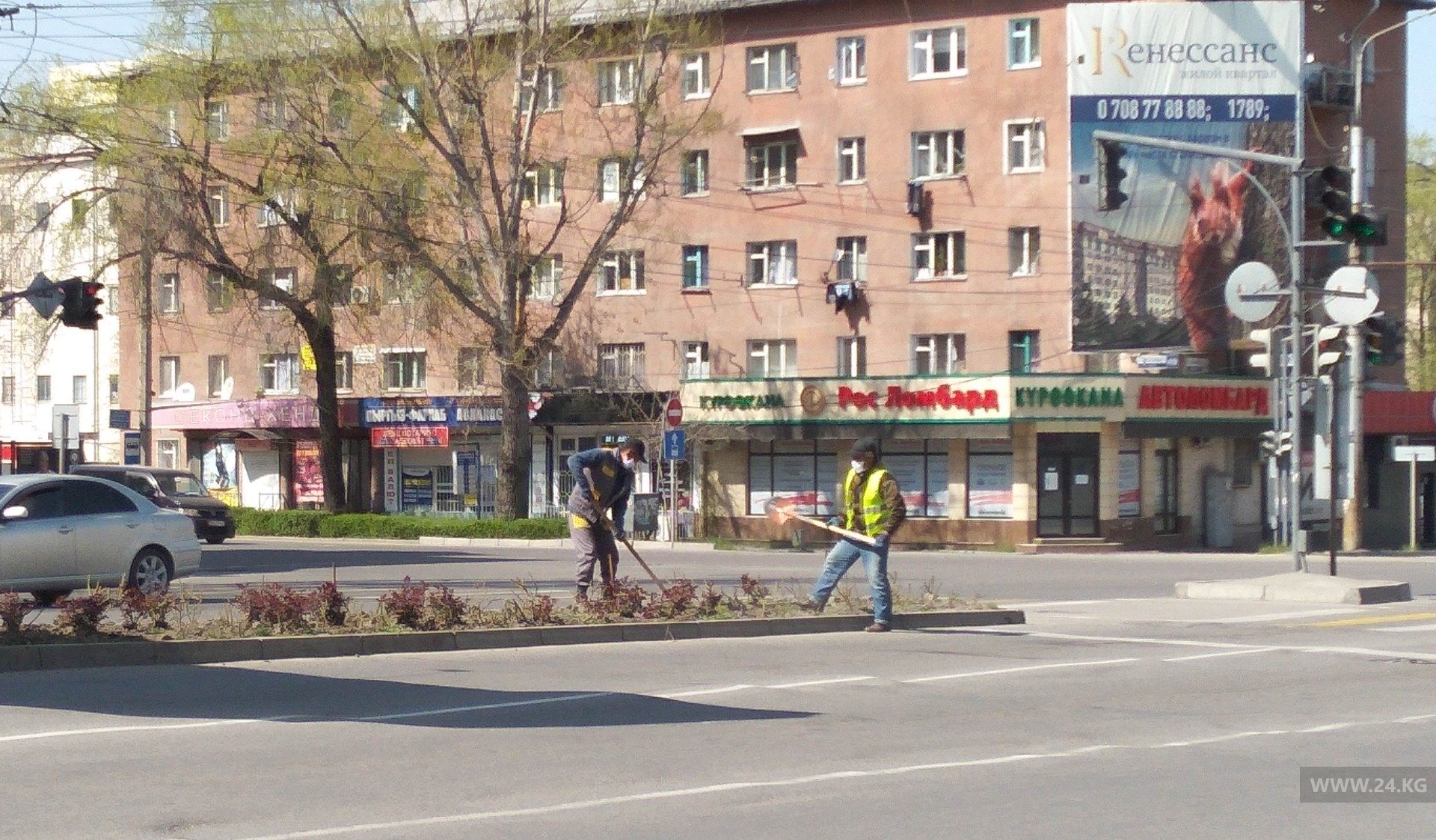 Сотрудники муниципального предприятия «Бишкекзеленхоз» приводят в порядок околодорожные клумбы с цветами.