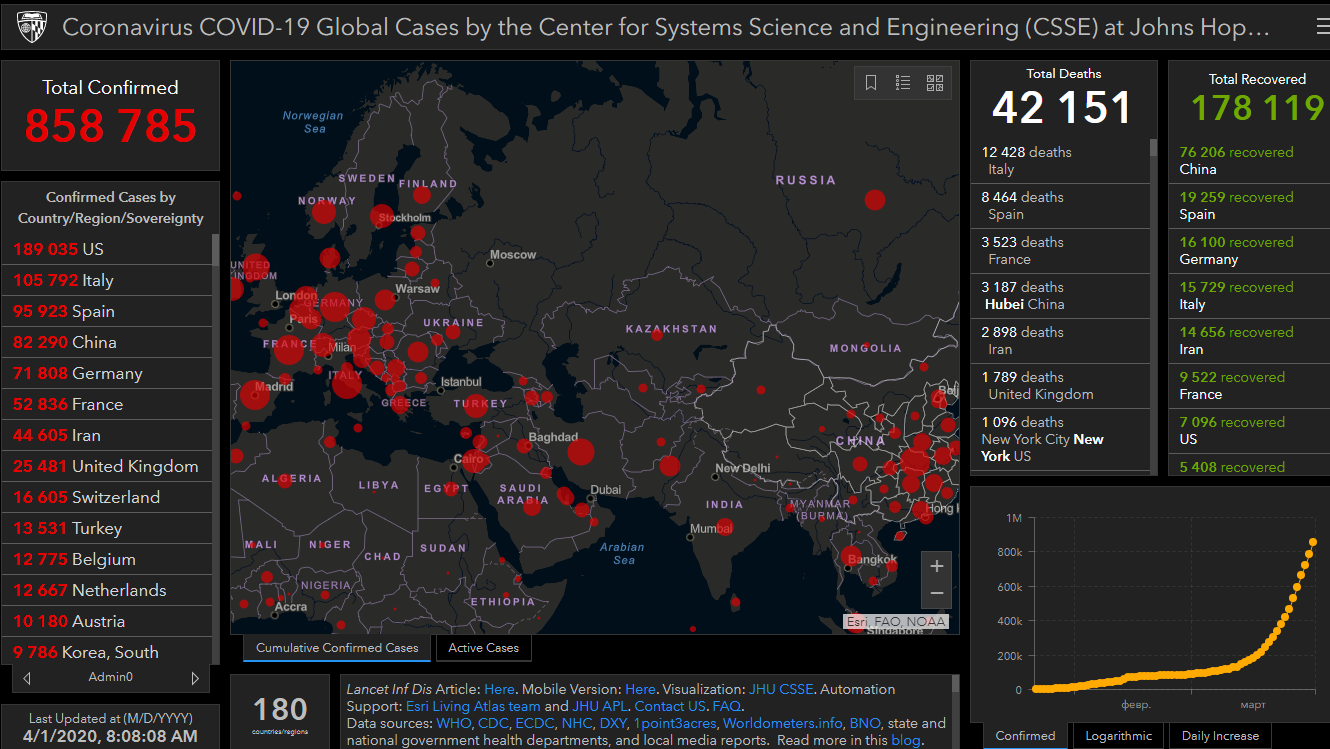 На сегодня в мире зафиксировали 858 тысяч 785 случаев заражения коронавирусом. Об этом свидетельствуют данные онлайн-карты, разработанной учеными.