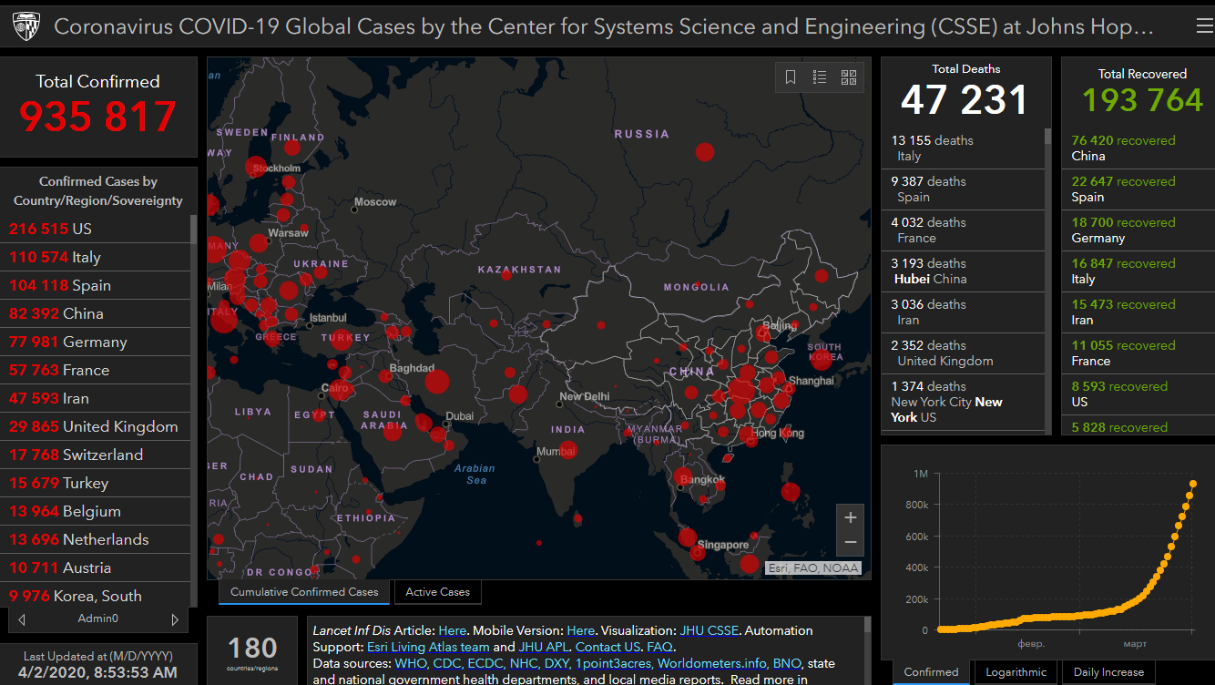 На сегодня в мире зафиксировали 935 тысяч 817 случаев заражения коронавирусом. Об этом свидетельствуют данные онлайн-карты, разработанной учеными.