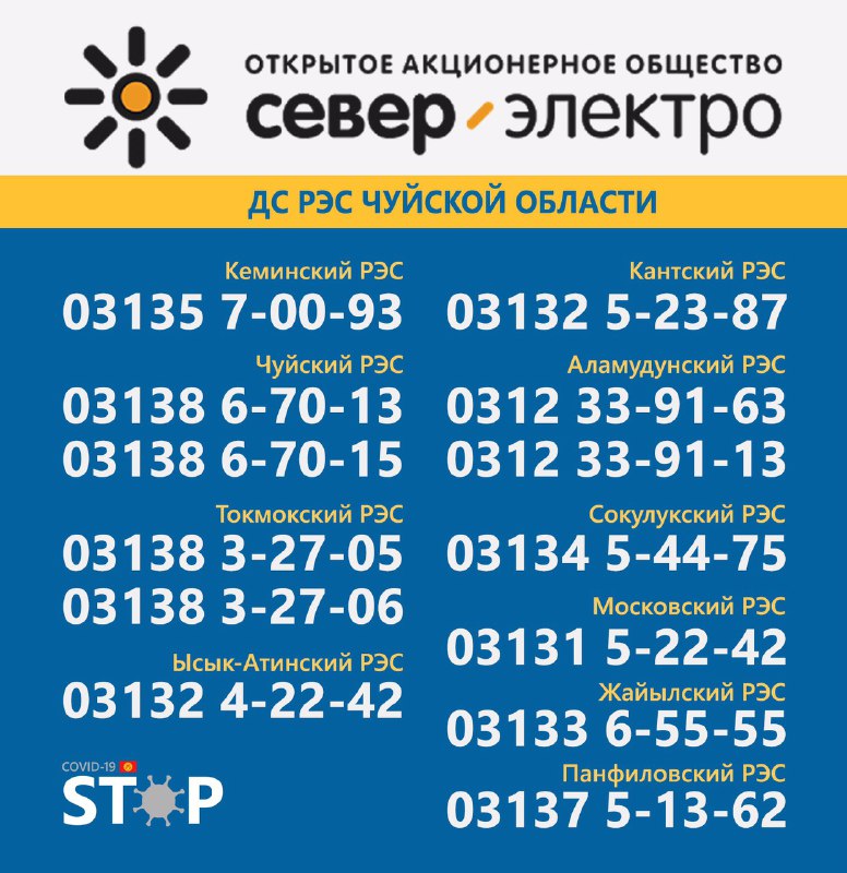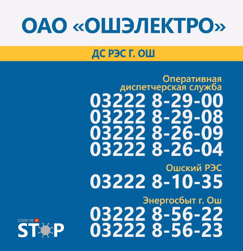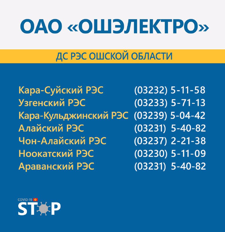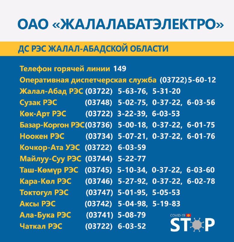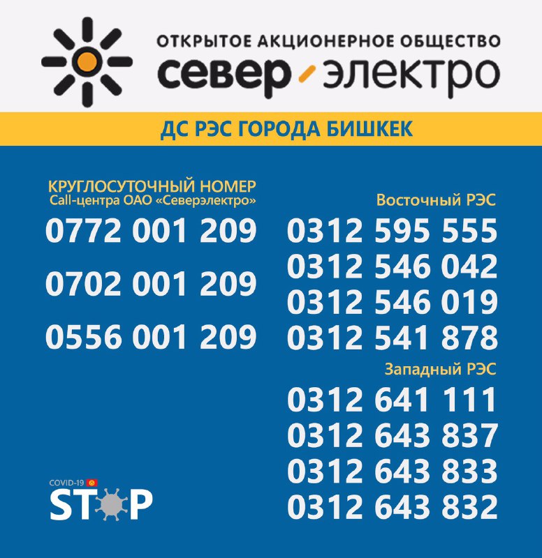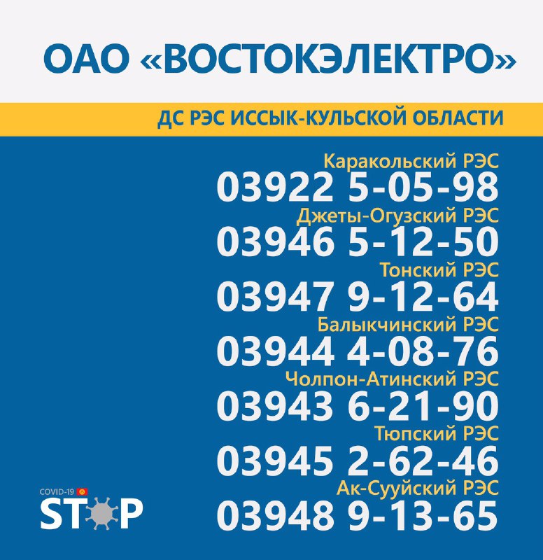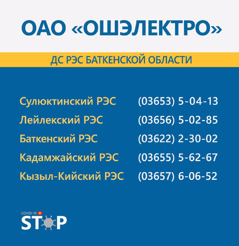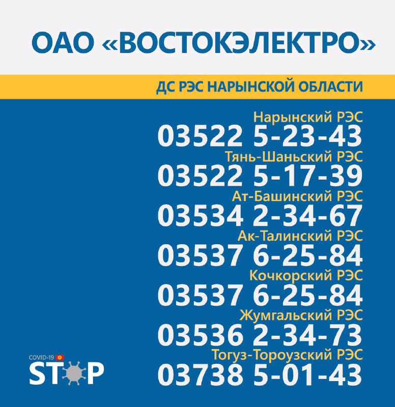 Во всех областях Кыргызстана круглосуточно работают горячие линии для вызова электриков и разъяснения интересующих вопросов. Об этом сообщает Республиканский штаб по борьбе с коронавирусом.