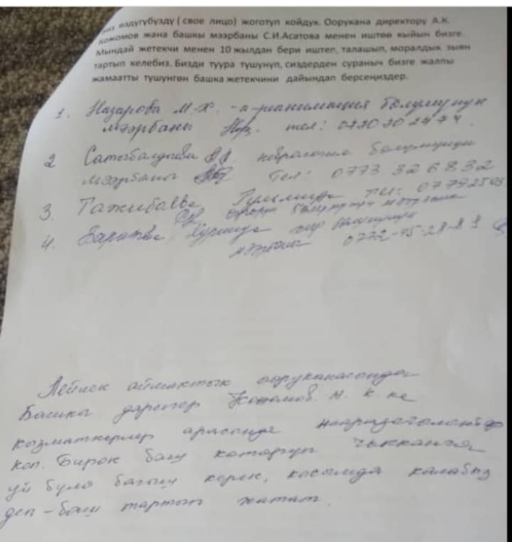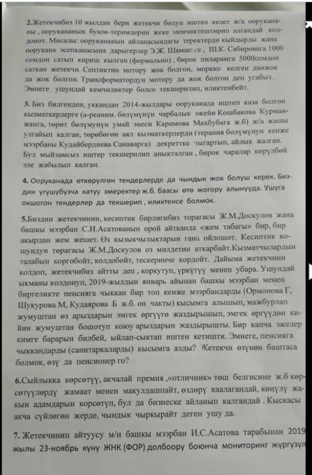 «Асан Кожомов работу в больнице превратил в бизнес. Он открывает лишние вакансии и берет на работу внештатников. Все, кто устраивается на работу, отдали главной медсестре больницы Сайрагуль Асатовой от 10 до 20 тысяч сомов. Некоторые говорят, что деньги давали лично директору», — пишут медики районной больницы.