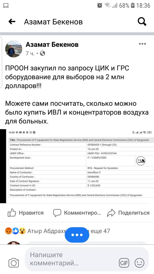 Кроме того, в соцсетях сообщается, что на оборудование для ЦИК и ГРС за счет средств ПРООН выделено $2 миллиона.