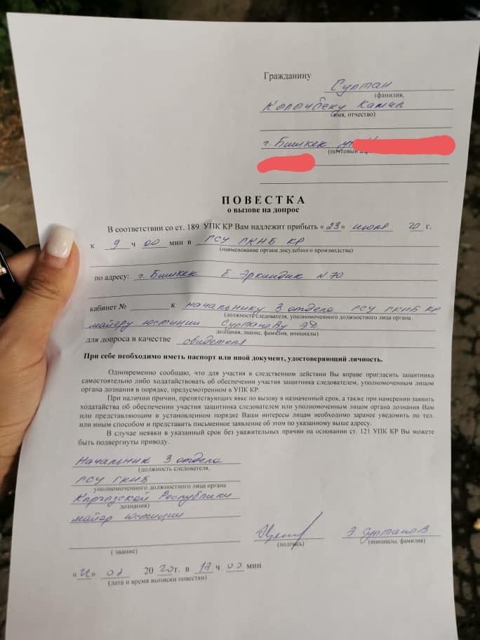В повестке говорится, что он должен явиться на допрос сегодня в 9.00.Отметим, ранее Кылычбек Султан в соцсетях призывал кыргызстанцев выйти на митинг за импичмент президента 5 августа.