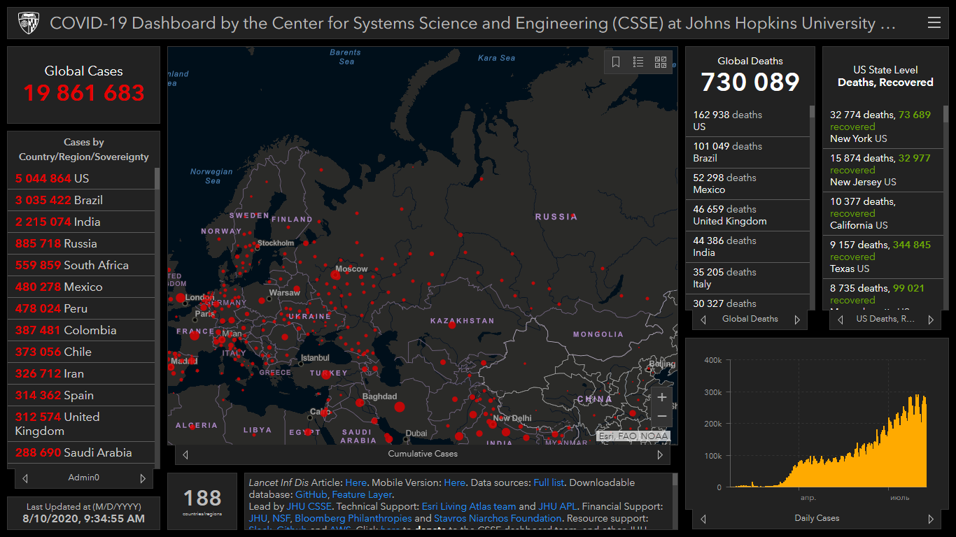 Всего в мире коронавирусом заразились 19 миллионов 861 тысяча 683 человека. Больше всего зараженных в США (5 миллионов 44 тысячи 864), Бразилии (3 миллиона 35 тысяч 422), Индии (2 миллиона 215 тысяч 74), России (885 тысяч 718), Южной Африке (559 тысяч 859), Мексике (480 тысяч 278), Перу (478 тысяч 24), Колумбии (387 тысяч 481) и Чили (373 тысячи 56).