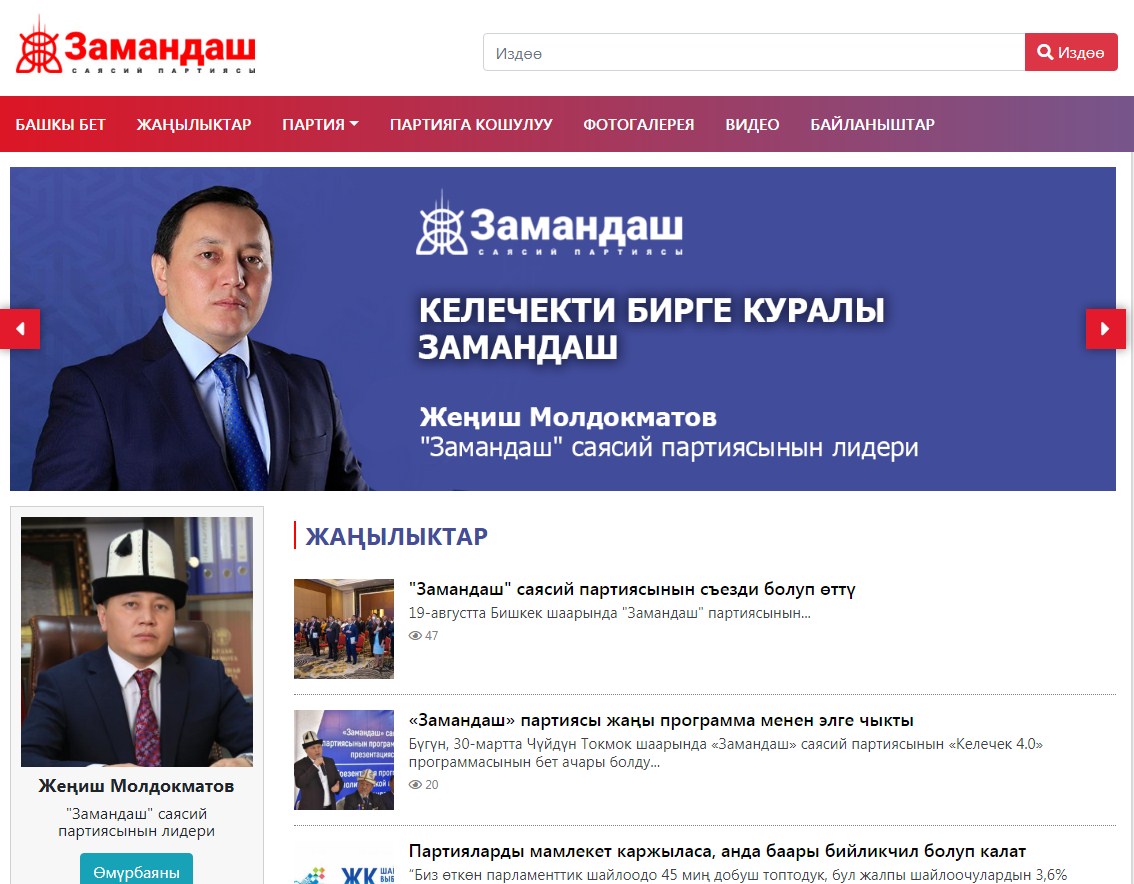 У партии «Замандаш» тоже есть свой сайт — zamandash.kg. Веб-ресурс двуязычный — новости выходят на кыргызском и русском. Есть много разделов, но часть из них не наполнена либо информация неактуальная, устаревшая. На сайте размещены всего три новости, старая программа, фото- и видеогалерея. В разделе «Контакты» указан только адрес штаба — микрорайон «Джал-28». Телефоны, электронный адрес не указаны.
