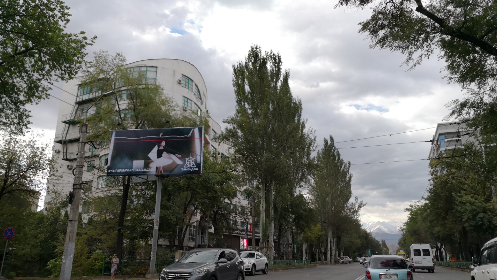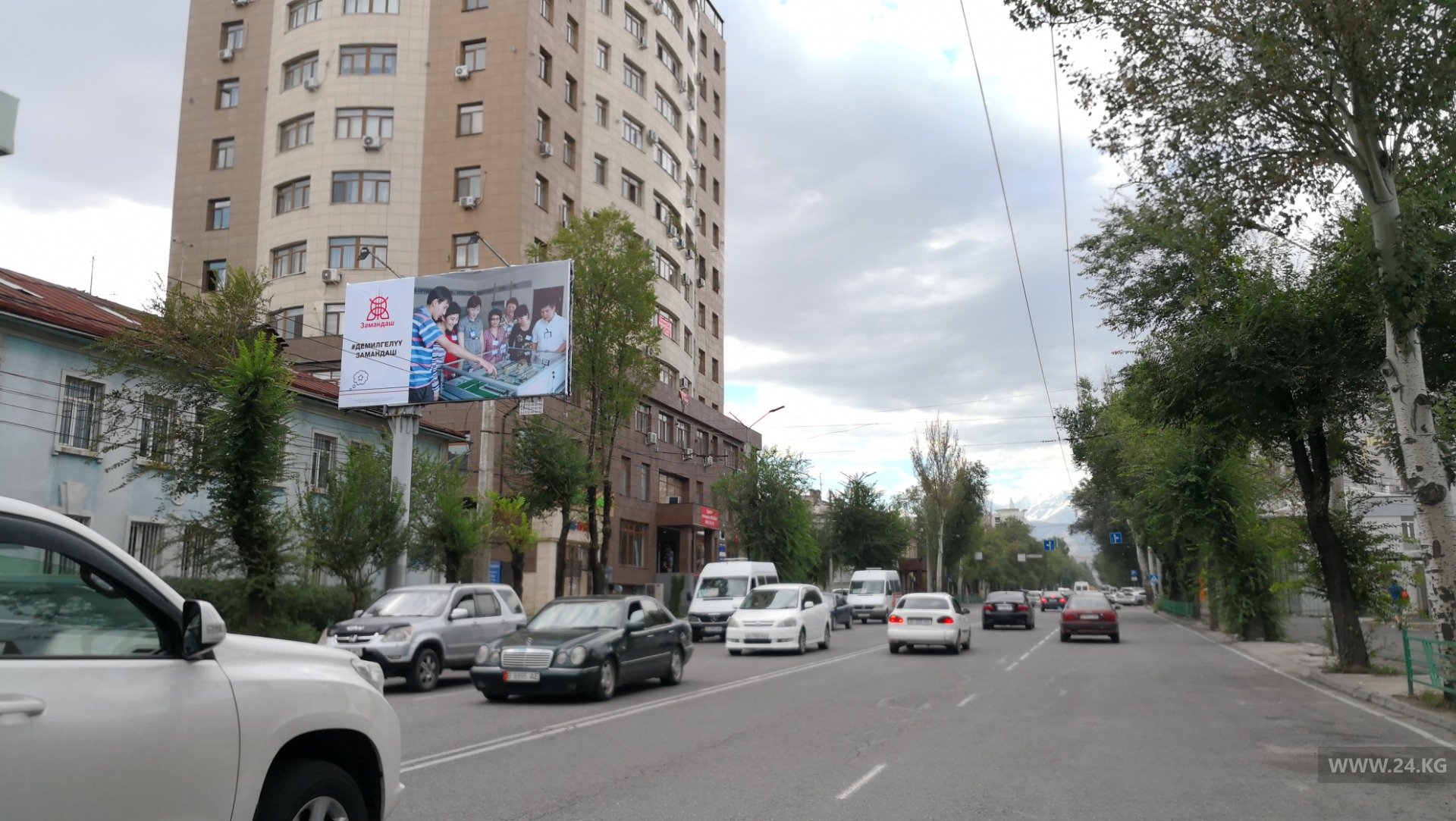 На отрезке от проспекта Чуй до Ахунбаева больше всего агитационных материалов партии «Биримдик». Самый масштабный баннер — на мосту по улице Льва Толстого.