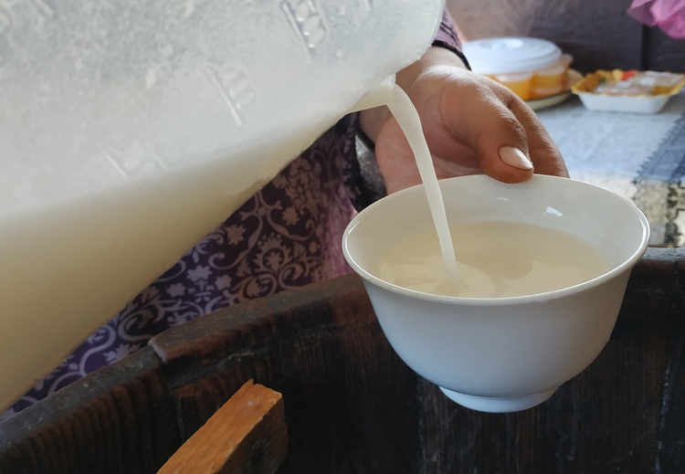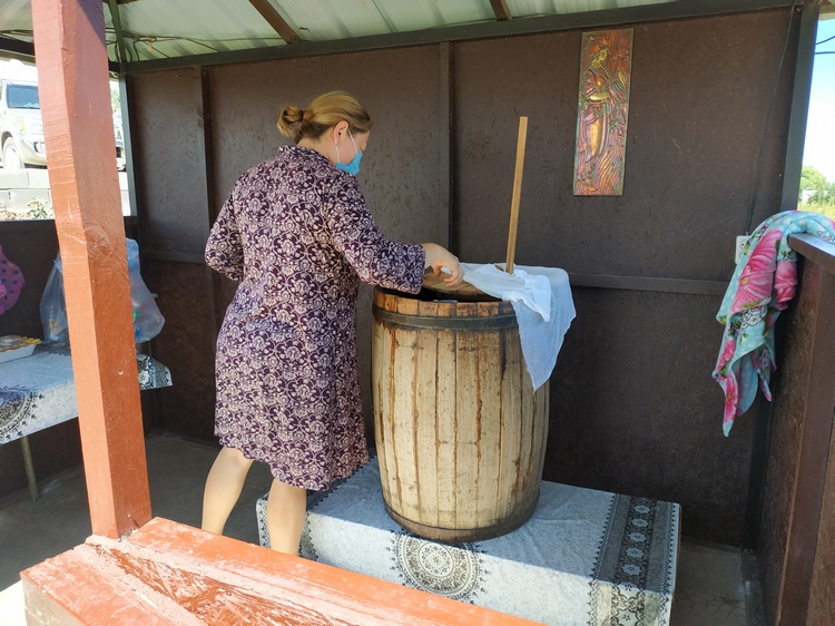 Хозяйка заведения первым делом наливает нам пиалу целебного напитка. Она долго и со знанием дела размешивает его в огромной деревянной бочке. После кристально белый кумыс переливается в специальный ковшик.