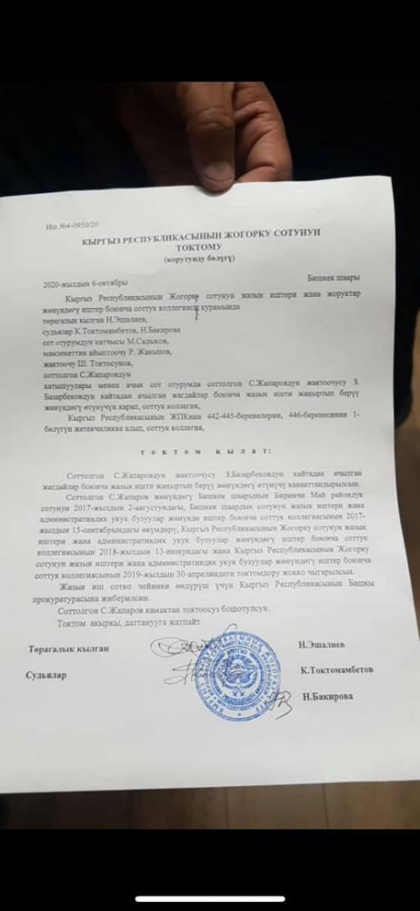 Садыр Жапаров был осужден и отбывал наказание в колонии. Суды всех инстанций приговорили его к 11 годам и 6 месяцам колонии усиленного режима за соучастие в организации митинга в Караколе в 2013 году. Его осудили по статье 227 «Захват заложника» УК КР. Его освободили после вчерашних беспорядков в Бишкеке.