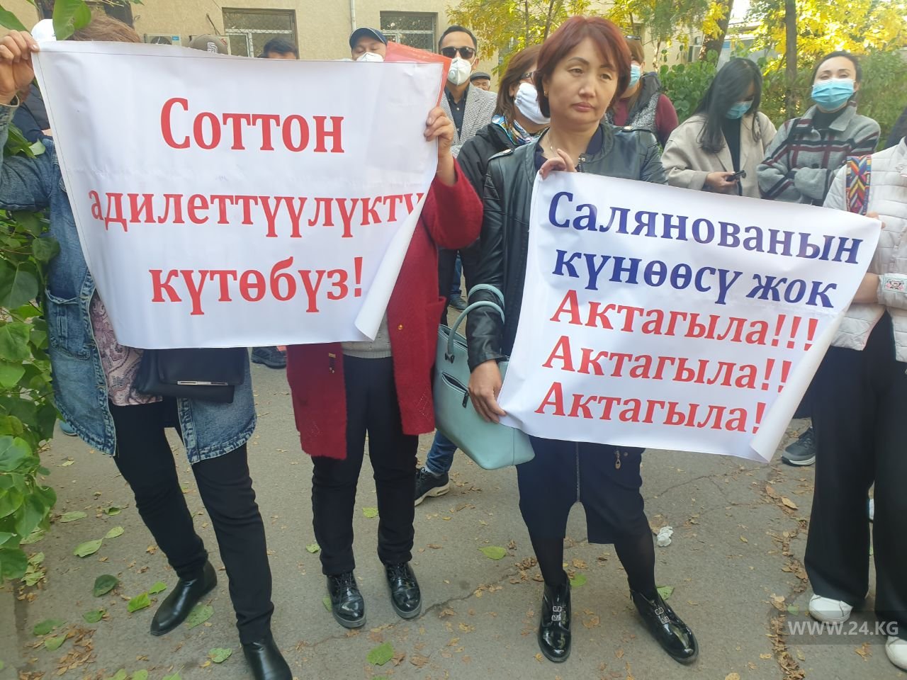 «Почему за короткое время судьи выпустили Алмазбека Атамбаева и других? Почему судья Жыпара Сабырова отменяет процесс в отношении Аиды Саляновой? Мы требуем, чтобы заседание состоялось, в протином случае будем требовать люстрации судьи Сабыровой. Аида Салянова должна быть оправдана», — говорят митингующие.