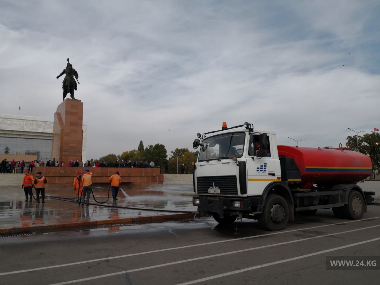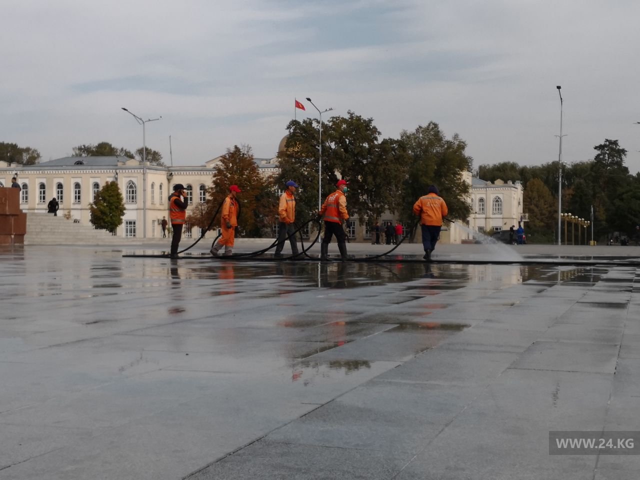 Сотрудники муниципального предприятия «Тазалык» отмывают центральную площадь Ала-Тоо после многочисленных митингов.