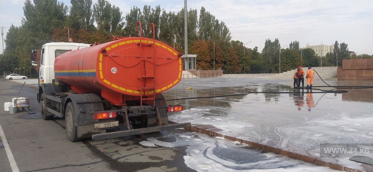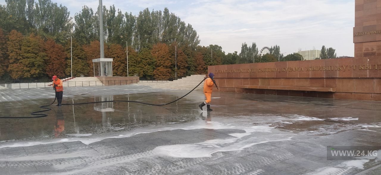 На центральной площади Бишкека спокойно. Митингующих нет. Сотрудники МП «Тазалык» занимаются уборкой.