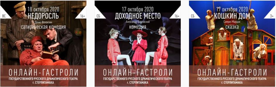 В рамках проекта театры Кыргызстана и ближнего зарубежья обменяются видеозаписями своих спектаклей. 17 октября артисты Государственного русского драматического театра города Стерлитамака (Башкортостан) будут играть спектакли «Кошкин дом» и «Доходное место», а 18 октября — спектакль «Недоросль».
