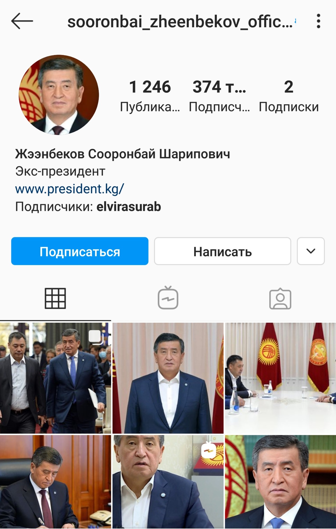 Примечательный факт: в Instagram экс-глава государства был подписан только на двух человек — своего пресс-секретаря Толгонай Стамалиеву и бывшего президента Алмазбека Атамбаева. Последний также все еще подписан на Сооронбая Жээнбекова.