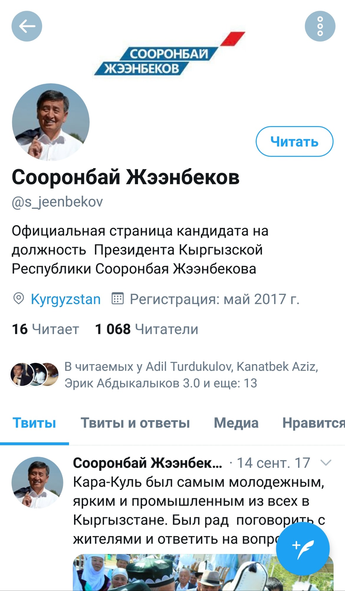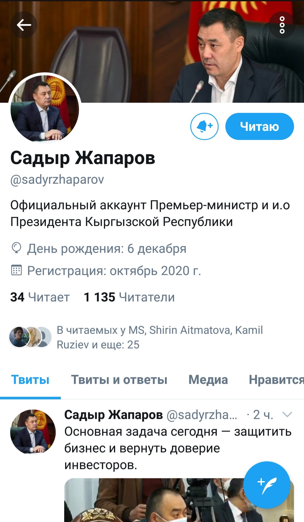 В Twitter также есть аккаунт Садыра Жапарова, однако он не верифицирован, поэтому невозможно точно определить, является он официальным или это фейк.